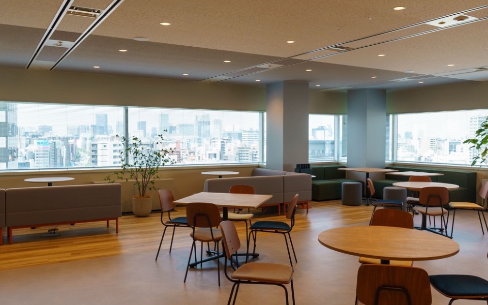 ワンフロアの開放的なオフィスとスカイラウンジなど、創造的な働き方を支えるユニファーストの職場環境を紹介します。